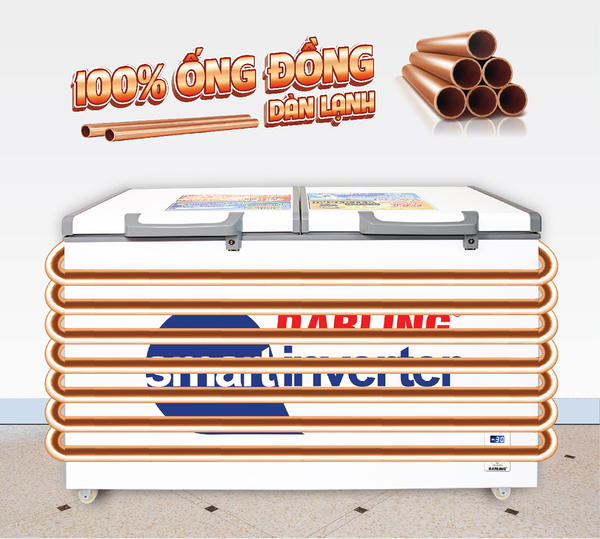 Dòng tủ đông Darling sử dụng dàn lạnh ống đồng cực kỳ bền chắc, có khả năng làm lạnh siêu nhanh, giữ nhiệt lâu nhất và tiết kiệm điện.