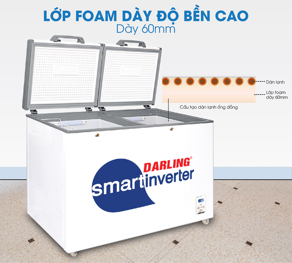 Lớp Foam dày được trang bị bên trong lòng tủ đông Darling giúp giữ lạnh tốt, cách nhiệt hiệu quả và giảm thất thoát hơi lạnh.