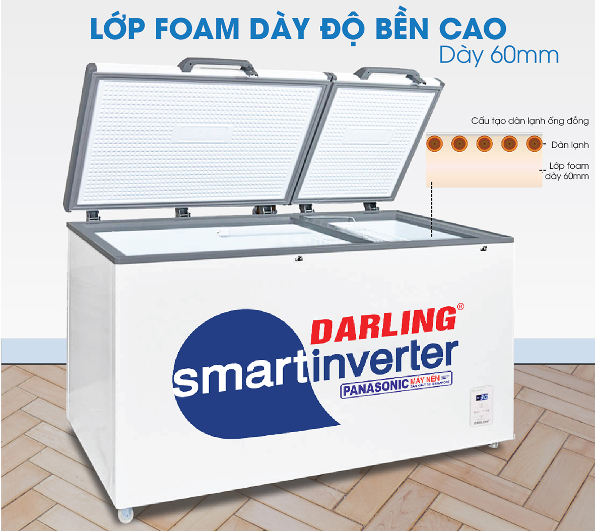 Lớp Foam dày được trang bị bên trong lòng tủ đông Darling giúp giữ lạnh tốt, cách nhiệt hiệu quả và giảm thất thoát hơi lạnh.