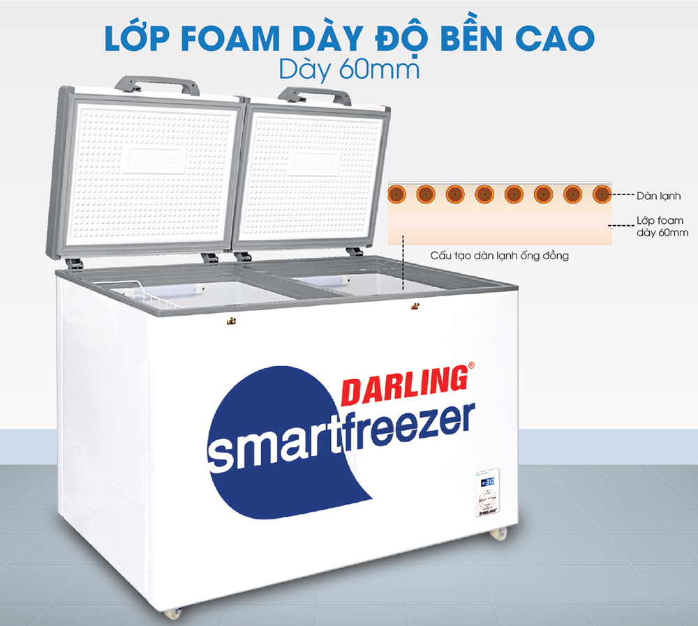 Lớp Foam dày được trang bị bên trong lòng tủ đông Darling giúp giữ lạnh tốt, cách nhiệt hiệu quả và giảm thất thoát hơi lạnh.