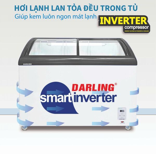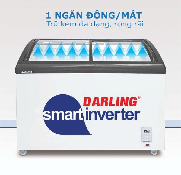 Dòng tủ kem Darling sử dụng công nghệ biến tần INVERTER có khả năng điều chỉnh vòng quay của máy nén, duy trì nhiệt độ hoạt động ổn định, giúp tủ vận hành vô cùng êm ái và tiết kiệm điện năng hiệu quả, khả năng vận hành bền bỉ đem đến sự bảo quản thực phẩm tuyệt vời cho bạn.