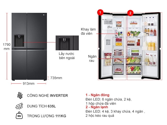 Tủ lạnh Side by side có dung tích 635 lít thích hợp cho gia đình trên 5 người