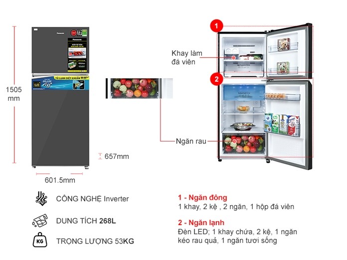 Thông số kỹ thuật Tủ lạnh Panasonic Inverter 268 lít NR-TV301VGMV