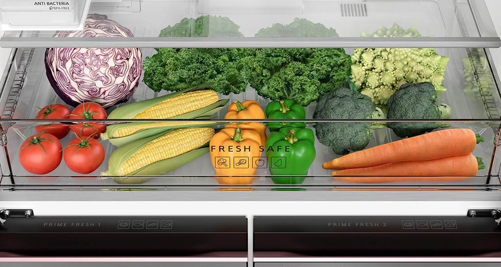 Tủ lạnh sở hữu ngăn bảo quản rau củ Fresh Safe thiết kế đặc biệt cho khả năng duy trì độ ẩm trong rau quả lên đến 90% để chúng không bị mất nước gây khô héo. Ngăn này cũng giữ mức nhiệt độ ổn định, không thay đổi, tạo điều kiện lý tưởng để trái cây và rau, củ, quả tươi lâu hơn, luôn căng mọng.