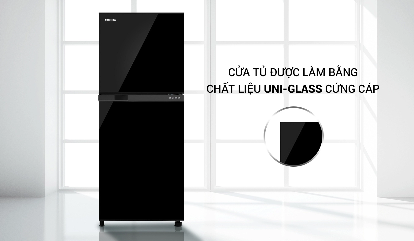 Tủ Lạnh Toshiba Inverter 233 lít GR-A28VM(UKG1) sở hữu vẻ ngoài tinh tế cùng sắc đen sang trọng giúp điểm tô thêm nét hiện đại cho không gian bếp nhà bạn và tiết kiệm tối đa diện tích sử dụng. Cửa tủ được làm bằng chất liệu Uni-Glass cứng cáp cùng gam đen thuận tiện cho việc lau chùi, thiết kế tay cầm rãnh ngang lạ mắt giúp không gian nhà bếp của bạn thêm phần sang trọng.