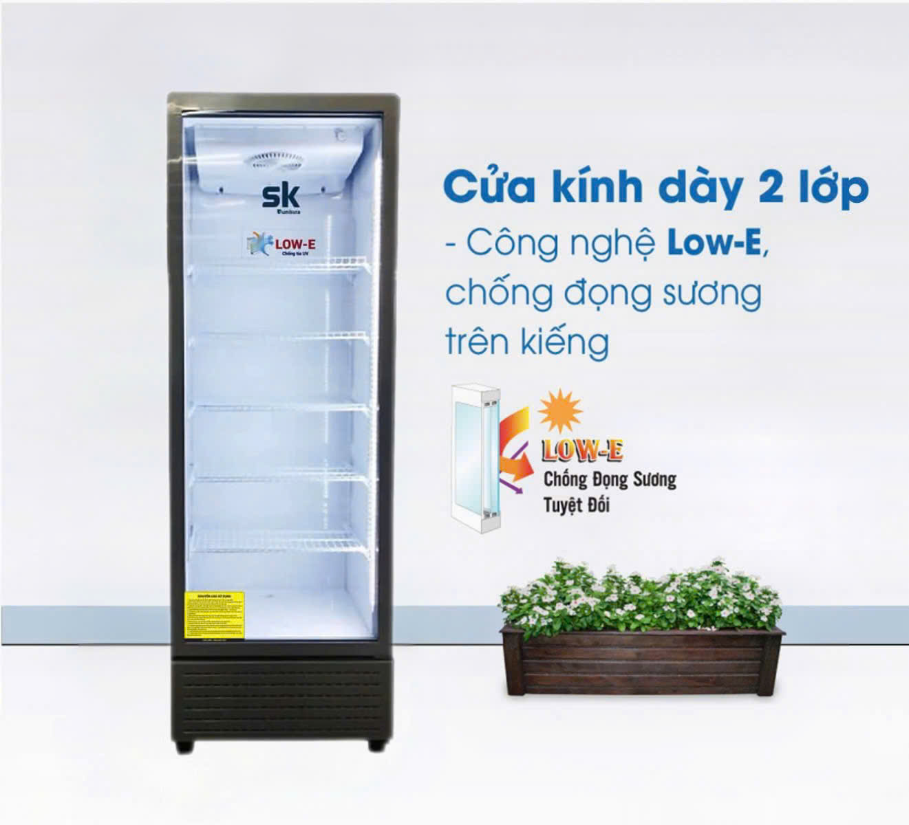 Cửa kính 2 lớp hút chân không chắc chắn, công nghệ Low-E cách nhiệt hiệu quả giúp tủ mát Sumikura SKSC-300.JS giữ lạnh tốt hơn và tiết kiệm điện năng.